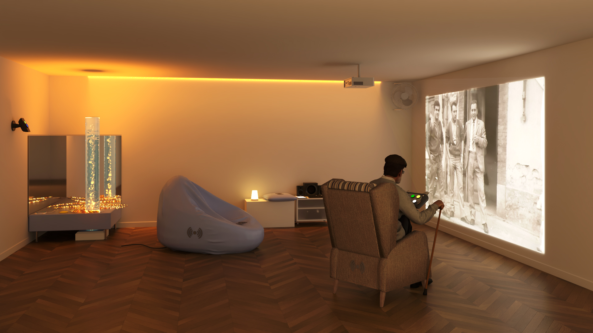 Le système est entièrement personnalisable et permet de créer ses propres environnements thématiques à partir d’images, de vidéos et de sons personnels.