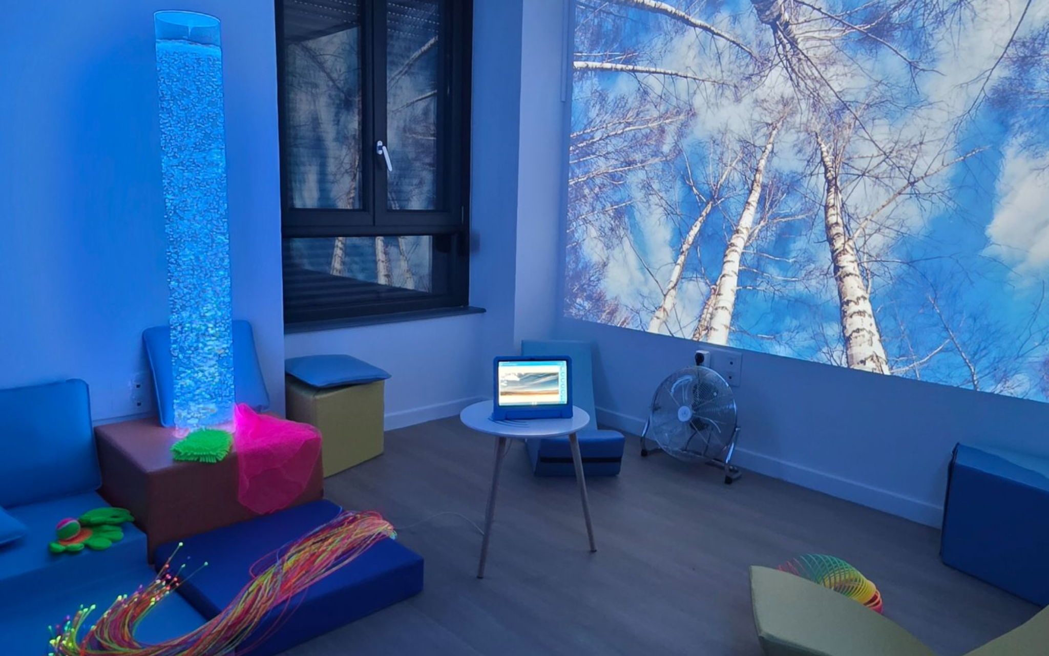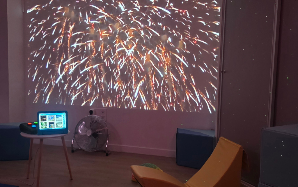 L’un des grands atouts de cette technologie réside dans la possibilité d’interagir avec l’espace. Différents systèmes de contrôle — comme Button 1, Button 6 ou des dés interactifs — permettent aux personnes d’interagir selon leur propre mode d’accès. Grâce à ces contrôleurs, il est possible de modifier la couleur ou l’intensité des tubes à bulles et des fibres optiques, de lancer des scènes sensorielles, d’apprendre par le jeu ou de créer des activités simples à l’aide d’éléments comme la lumière ultraviolette.